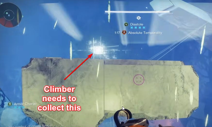 The main danger for the climber are Vex Imps that continuously spawn. Do your best to fend them off. Rocket sidearms or rocket pulse rifles are recommended. Invisibility and barricades help as well.