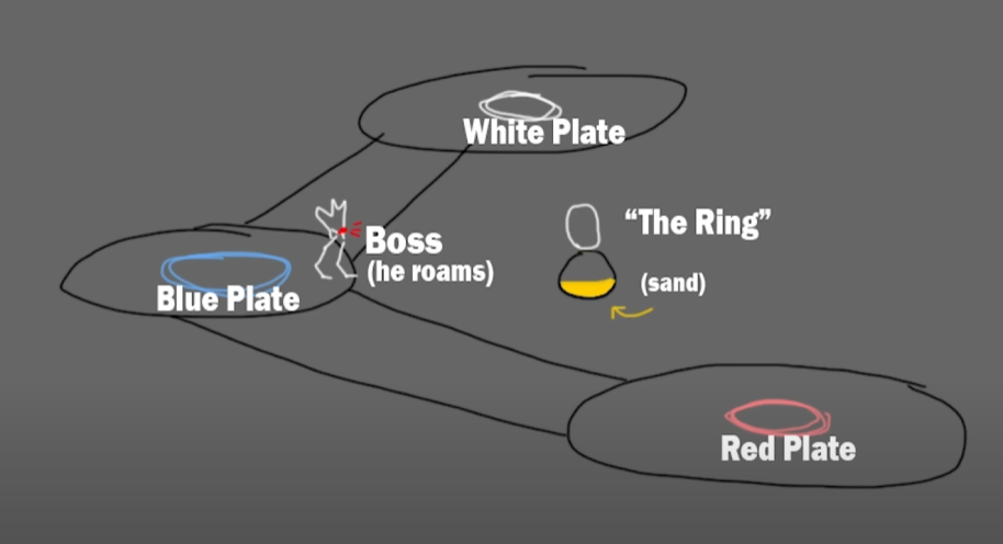 The boss will spawn at the colored plate matching the ring's color. If the players are far away, the boss will walk to a predetermined plate depending on which plate it started on. If the raid goes to the same plate as the boss, it'll basically stay there and shoot at the raid, allowing for hard-hitting close-ranged weapons to shine, such as Lord of Wolves and Legend of Acrius.